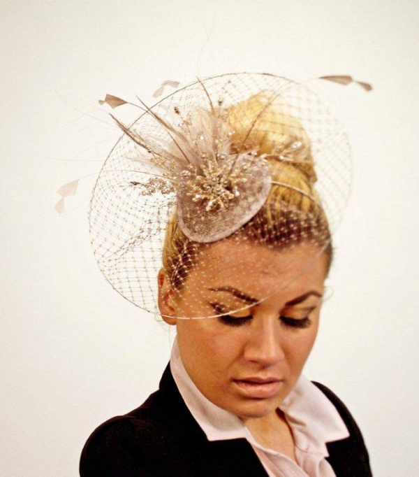 Made to order in any colour, this one is made in a neutral mink beige colour. This is an elegant side disc hair fascinator with soft feathers and swarovski crystals fixed in the centre of a net circle disc. Made on a coordinating coloured comfortable alice band.